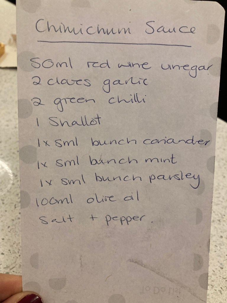 - I didn’t follow the recipe for the sort-of chimmichurri sauce but used the one below instead – just blitz all the ingredients in a food processor. I also made loads to serve on the side which the recipe doesn’t say to do.
