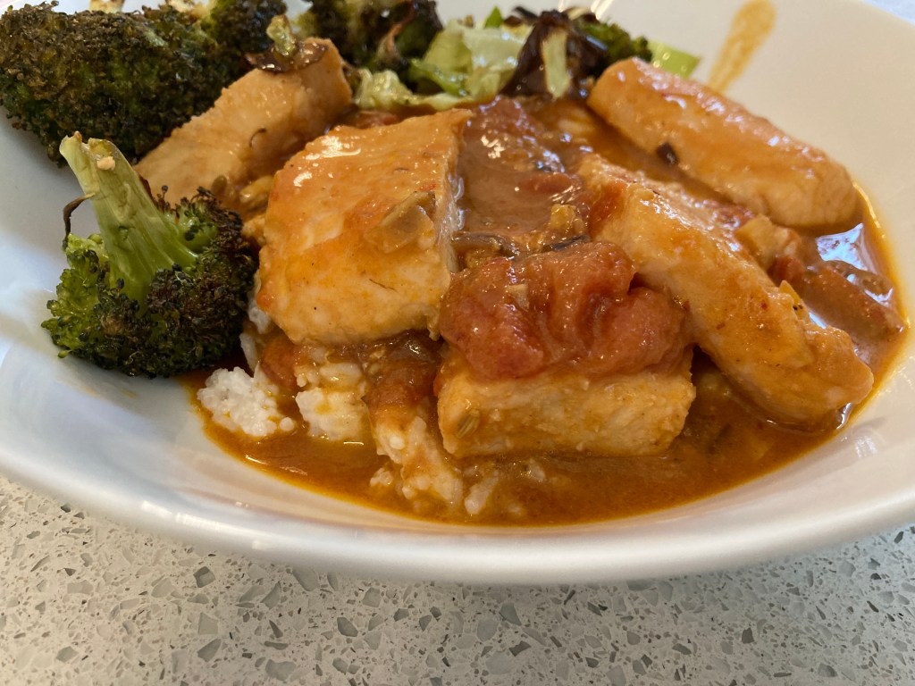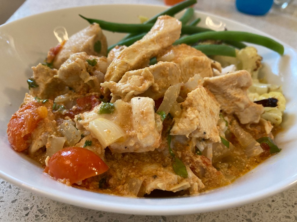 I love prawns and was really looking forward to making this Madagascan prawn curry recipe from Palatable Pastime. My cooking partner in crime had already made it and given it a thumbs up. I then invited people to join us for dinner. Whilst in Tesco shopping for ingredients I thought I had better check on the prawnability of the guests and sure as bob, there’s an allergy. Quick text home to COD to PUT THE PRAWNS BACK IN THE FREEZER PRONTO, and we switched to chicken. So, I made this with diced chicken breast. It was super yummy. I’d go hotter on the chilli but I had small people in the mix so kept it warm rather than my preferred scorchio. I served it with oven roasted curried broccoli and cauliflower as well as good old green beans.