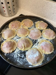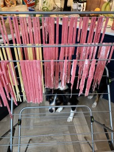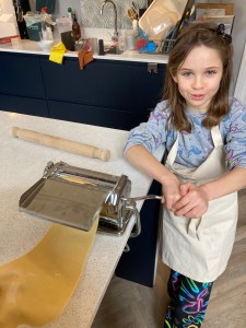 But we did get a lot of beetroot over a two week period so I wasn’t quite done! Friends came over for a dinner party and it’s been ages since I got out the pasta maker. I really love making pasta and ACOD asked if she could be my trusty helper! Cue some beetroot and feta (big) ravioli and some beetroot tagliatelle. I adapted this Riverford Pink Beetroot Pasta to make the filling and then used the walnut and basil (I couldn’t find fresh oregano) pesto as a topping. For a sauce I made a burned butter sauce with fresh basil. It was pretty good. Totally forgot to take pics of finished dish……..