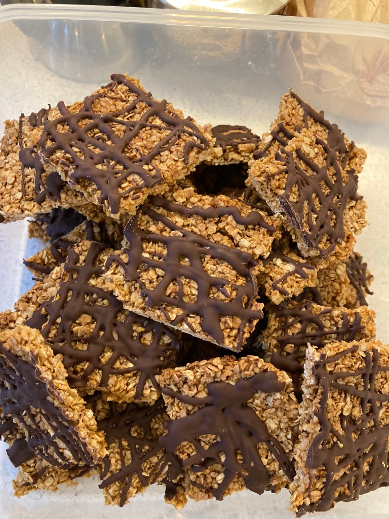 I double the recipe and spread thinly in a baking tray that fits my oven – so a big one (on baking paper) and cook for 15-17 mins. I also melt 1/2 bar of milk and 1/2 bar of dark chocolate, mix and then drizzle onto the biscuits when they have cooled and been cut (do cut while warm!).