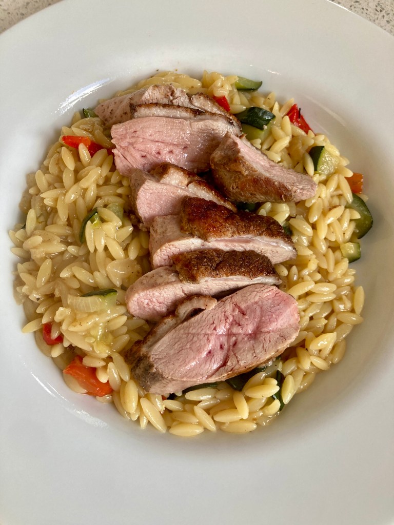 Anyway, deciding I didn’t care about the opinions of my offspring, I got home and went to the cupbaord to check on the availability of said couscous. Lucky for them, we didn’t have any. We did have orzo pasta. Idea! Duck breast on an orzo pasta risotto. Yes, Yes, Yes!